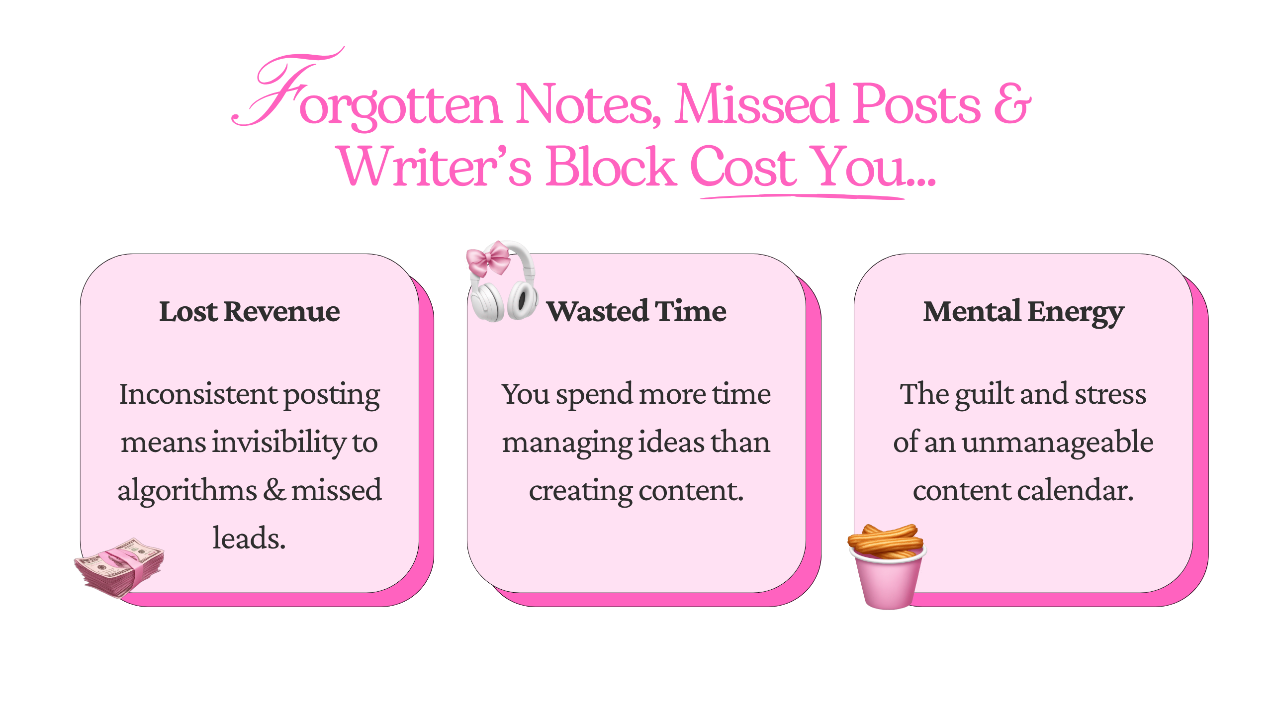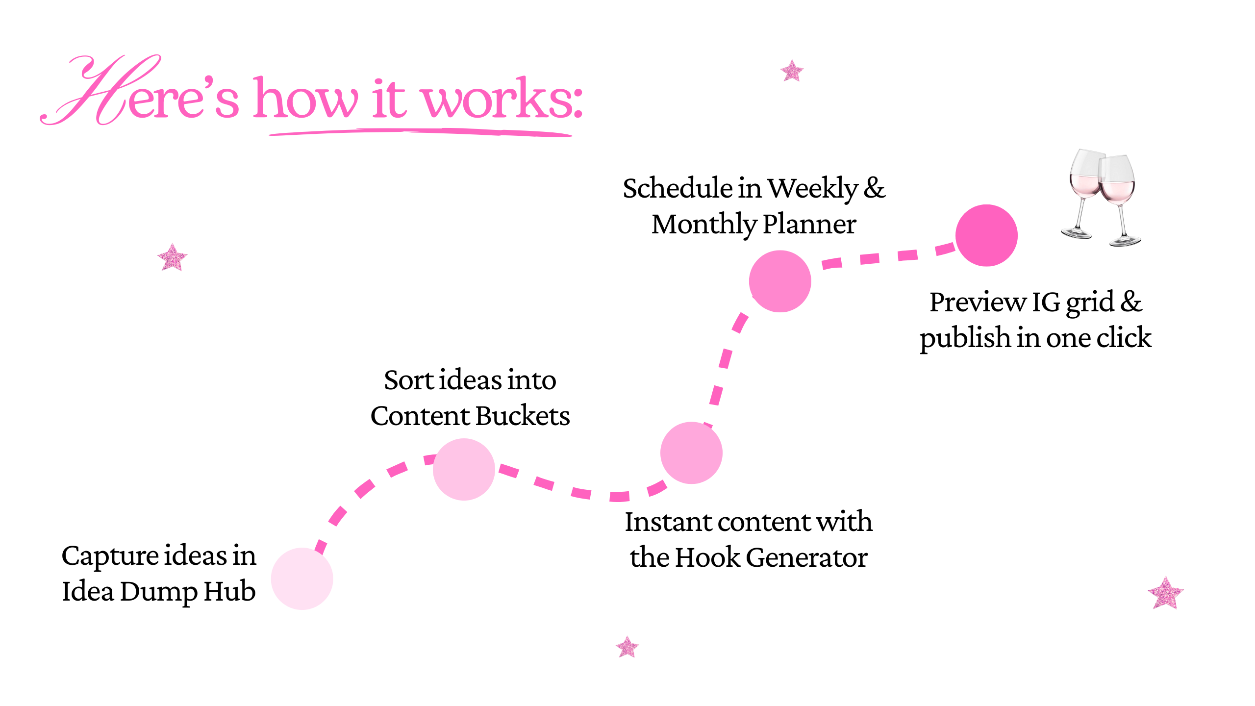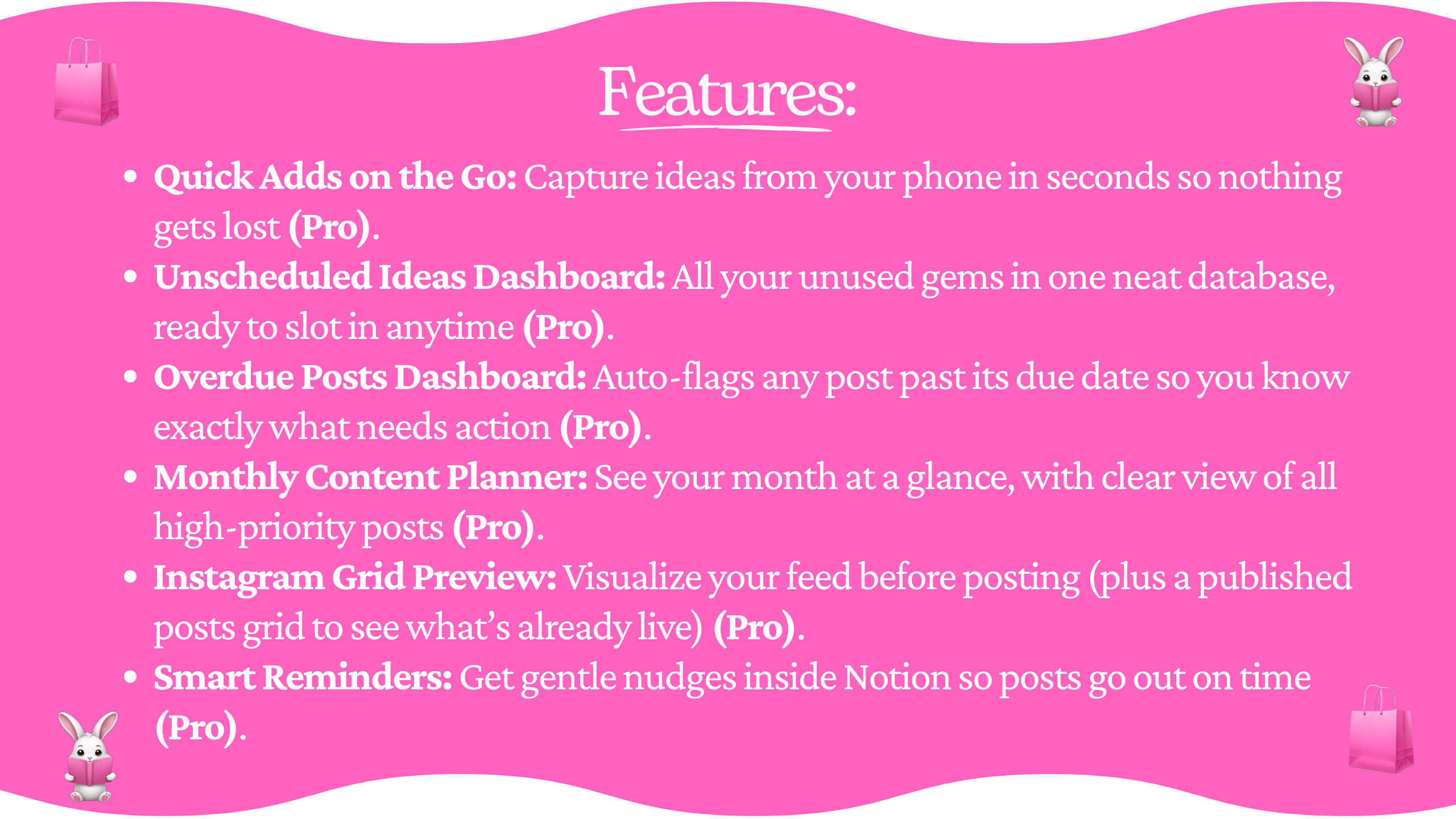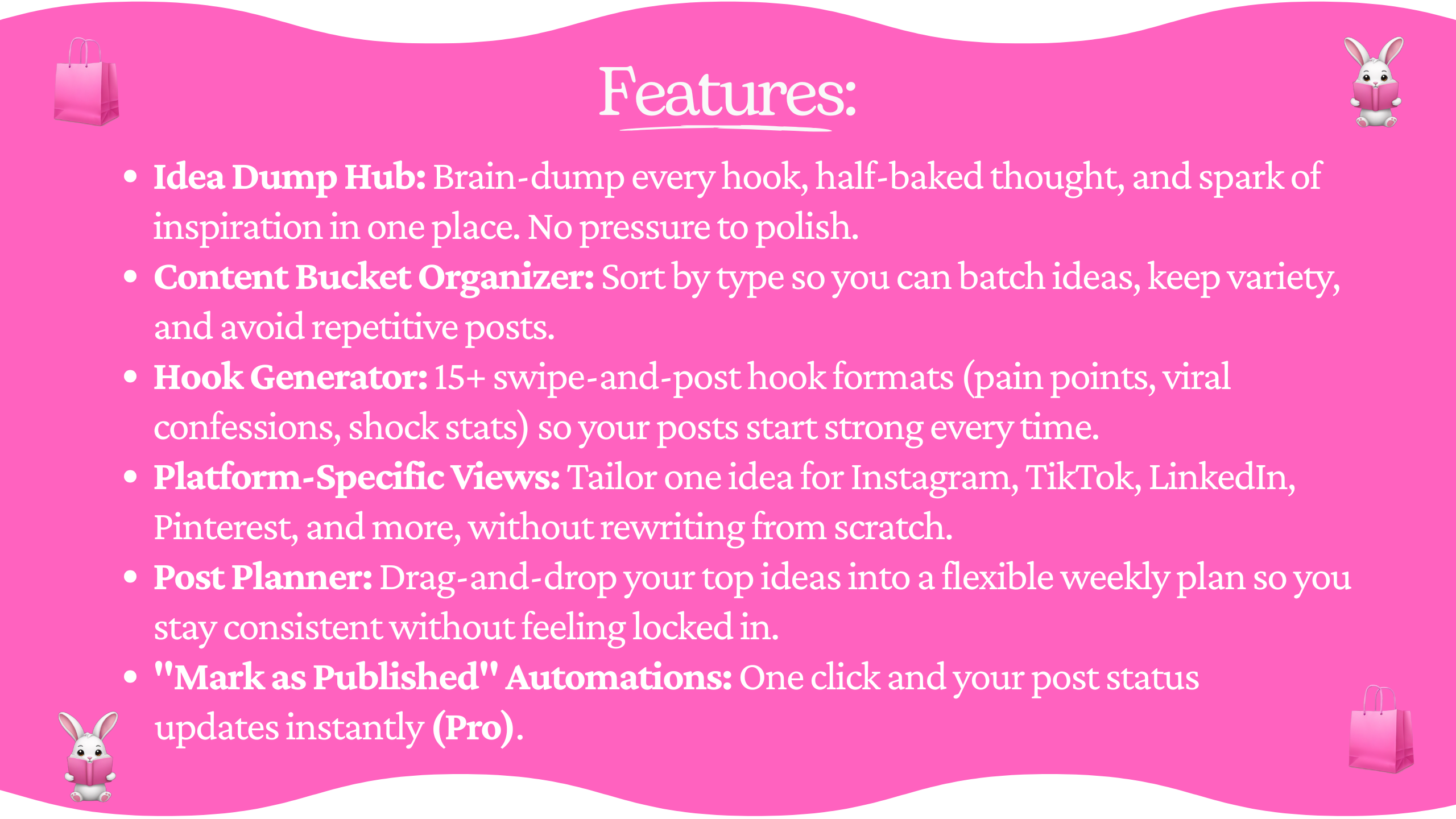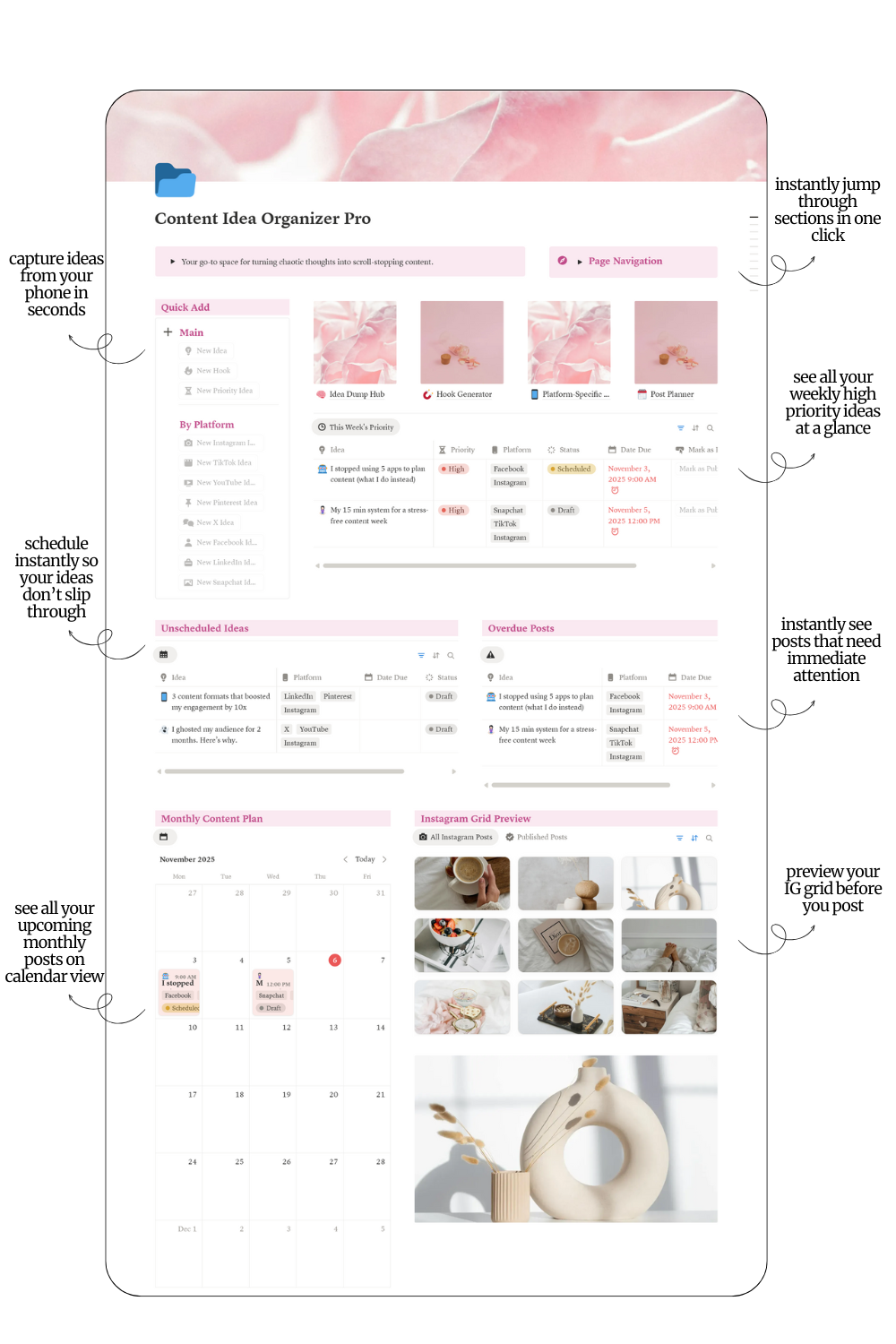 Brain-dump every content idea, sort by content buckets, and use 15+ hook templates to start posts that stop the scroll. Plan your week, preview your Instagram grid, and publish on time with smart reminders.