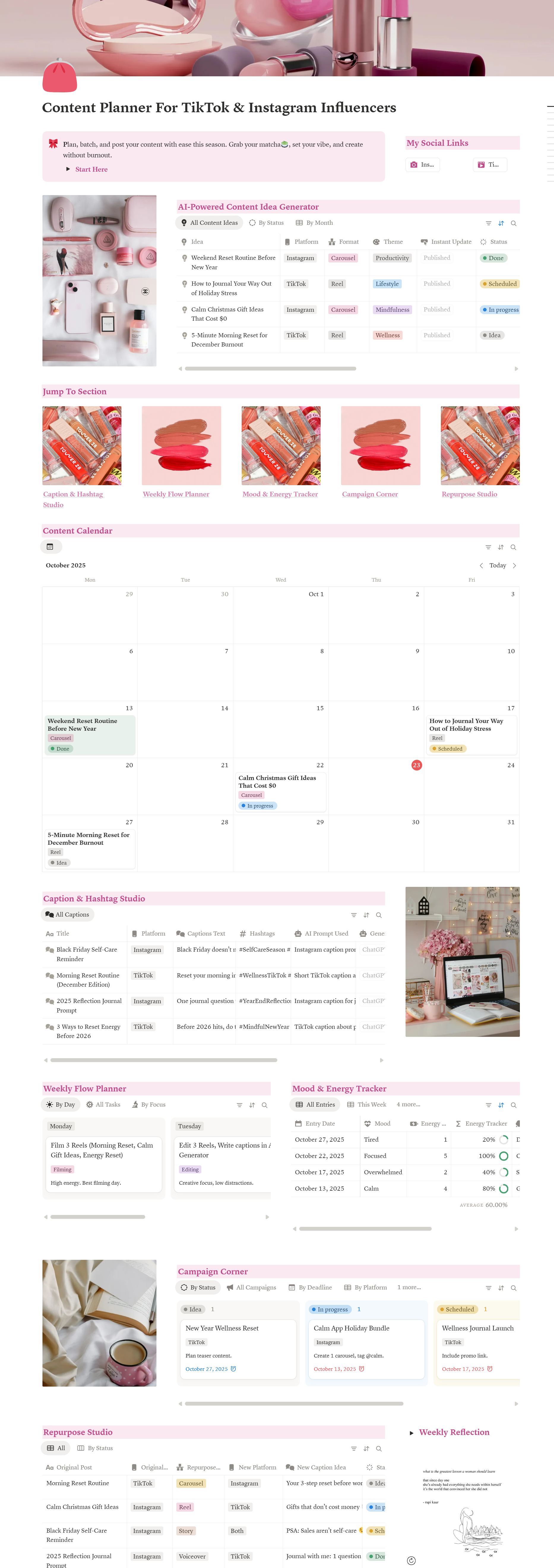 The Content Planner for TikTok & Instagram Influencers is a Notion template built for lifestyle and wellness creators who want to: