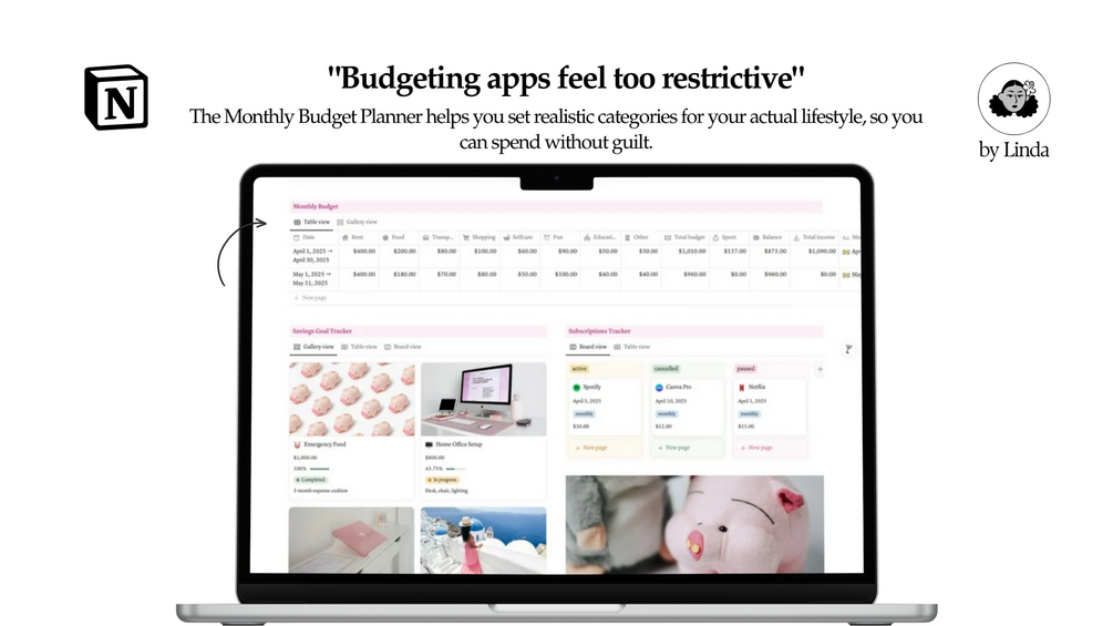 - Monthly Budget Planner- Set realistic budgets that fit your lifestyle, so you stick to them without feeling restricted.
