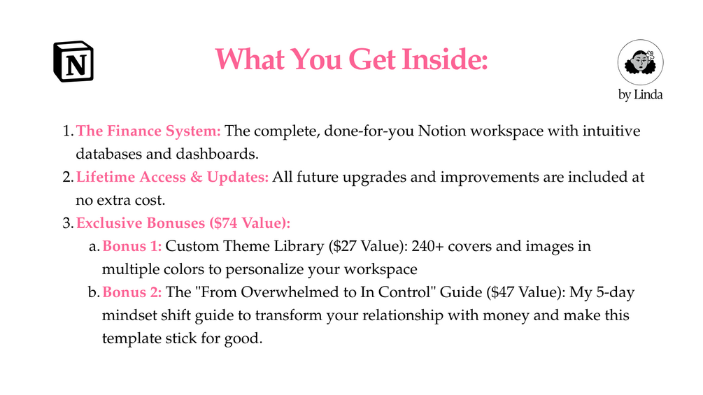 - The Finance System: The complete, done-for-you Notion workspace with intuitive databases and dashboards.