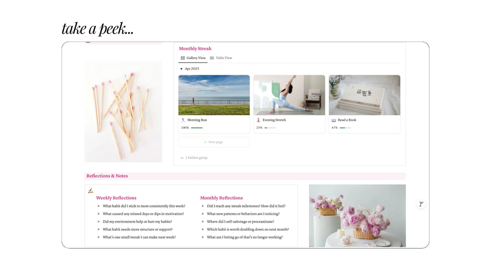 Dive into the Daily Habits Database, flex your Monthly Streaks, and set those Weekly Goals, all wrapped in pastel vibes that make consistency feel like a treat. Reflection & Notes? Yep, there’s a cozy corner to spill the tea on your wins (and that one “oops” day).”
