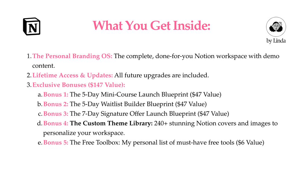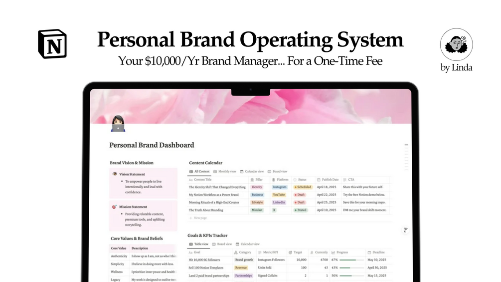 - The Personal Brand OS: The complete, done-for-you Notion workspace with demo content.