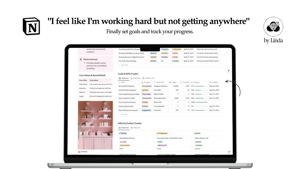 If your ideas, content, goals, and offers currently live across random notes, half-finished docs, and scattered tools, this template gives you a single source of truth, so you stop guessing and start operating with intention.
