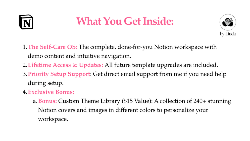 - Bonus: The Custom Theme Library: A collection of 240+ stunning alternative page covers and workspace images so you can customize the look to match your vibe. ($15 Value)