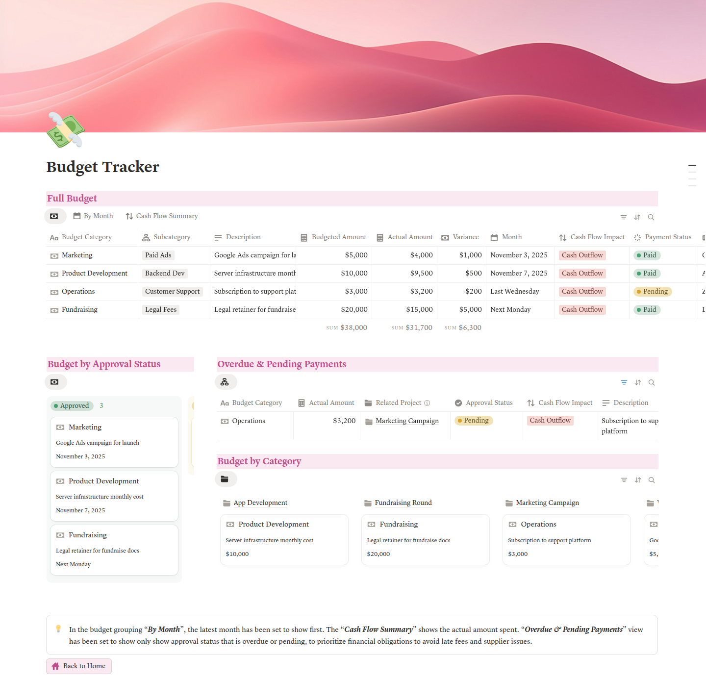 - Real-Time Budget & Financial Tracker: Built-in budget tracking with automatic variance calculations. Catch overspending early and keep your runway visible and under control. Investor-ready numbers, always up to date.