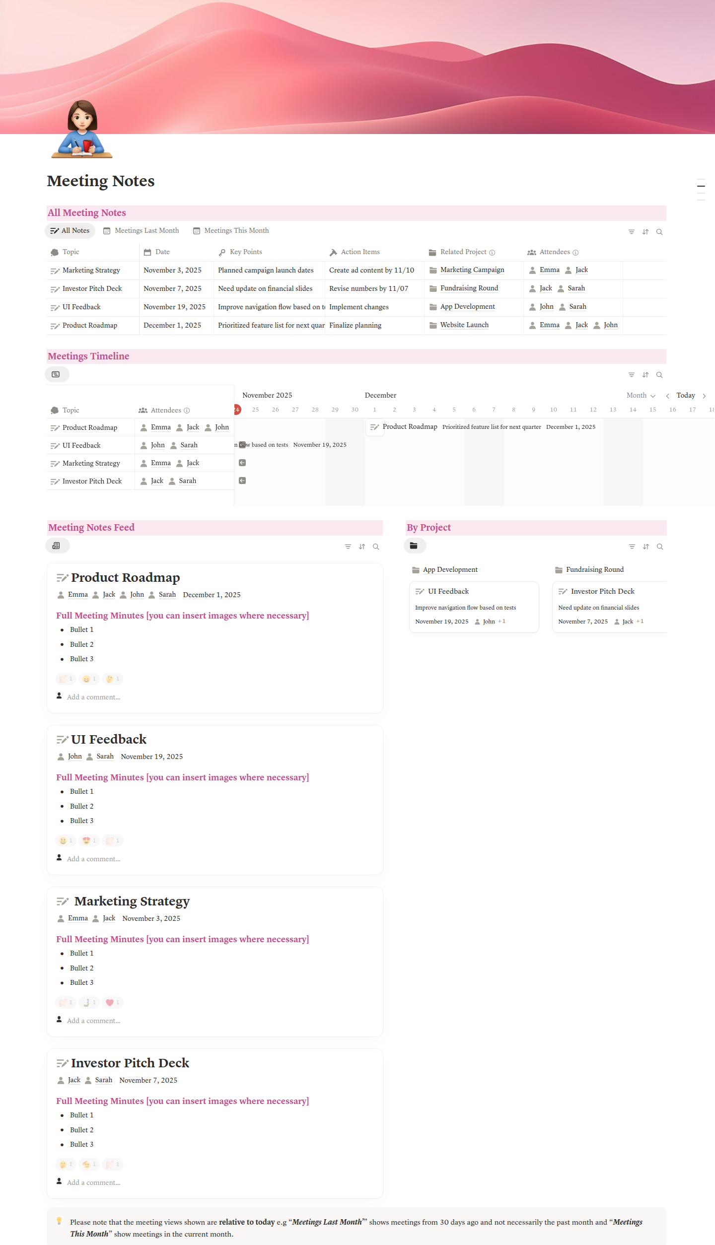 - Meeting Notes & Decision Log: Capture decisions, assign action items, and link everything to projects and owners. Nothing falls through the cracks. Every decision stays documented and searchable.