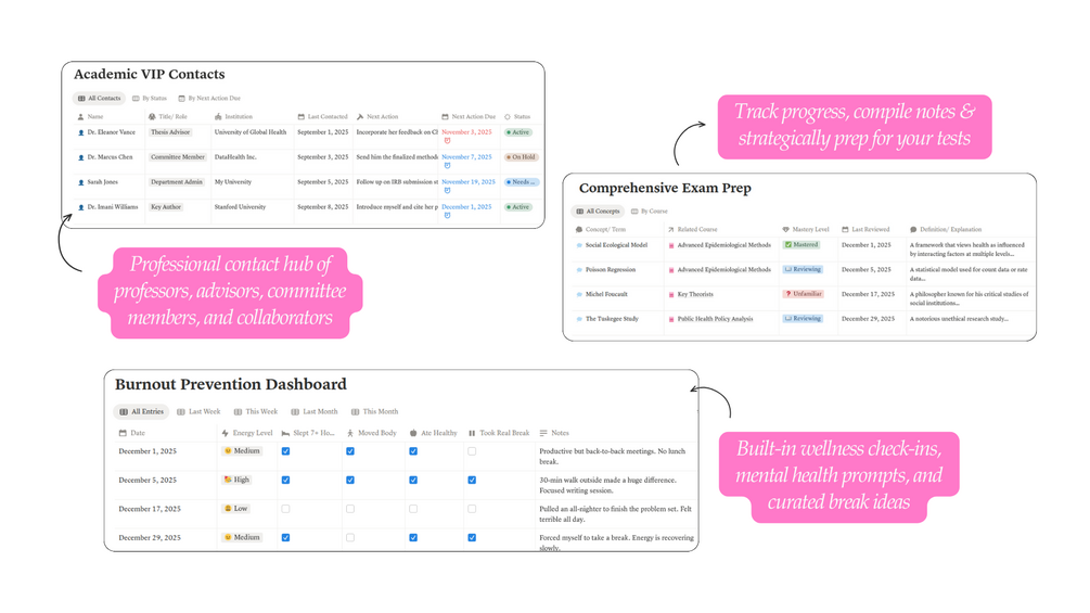 - BONUS 1: The Academic VIP Contact Database: This relationship CRM helps you manage your advisor, collaborators, and network professionally, ensuring you never miss a critical follow-up. ($47 Value)