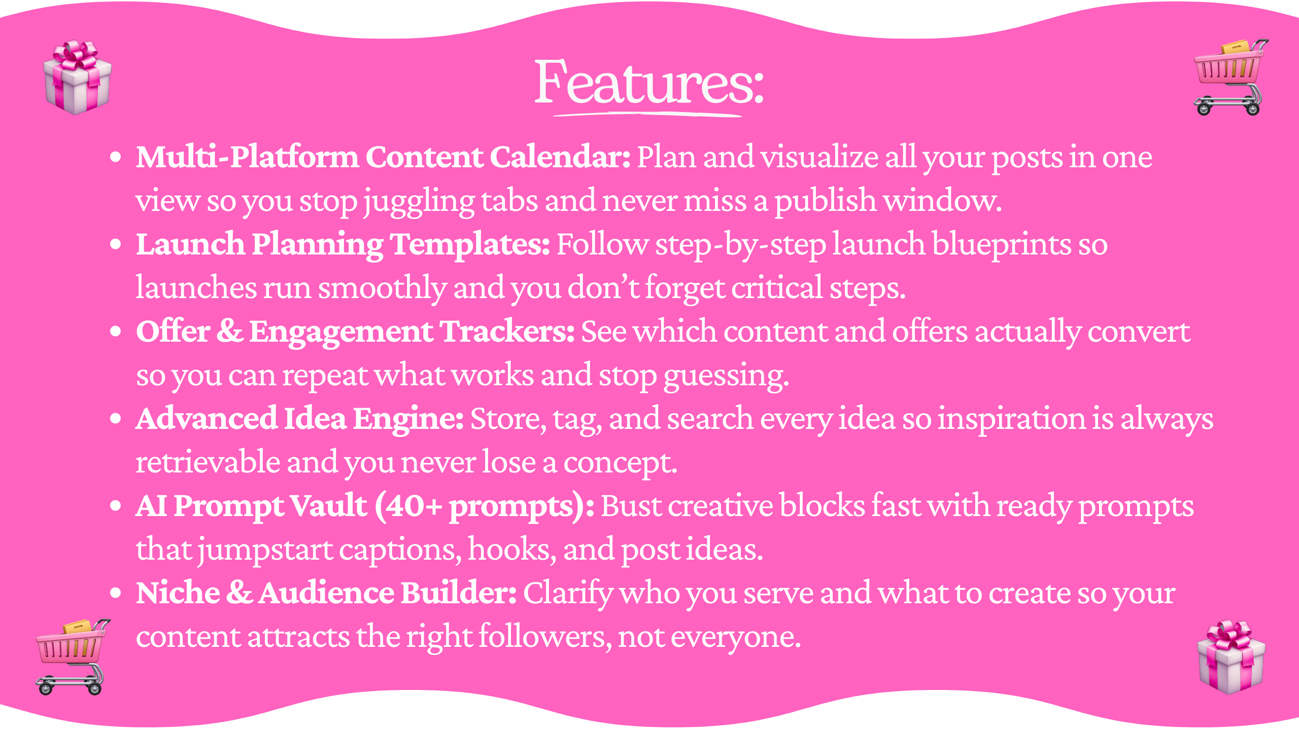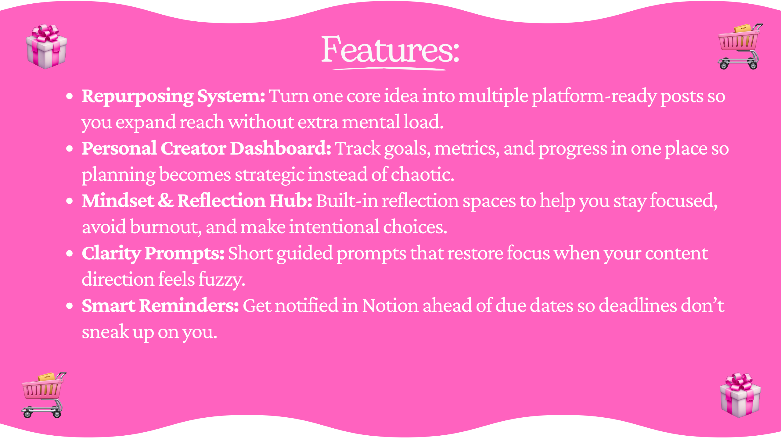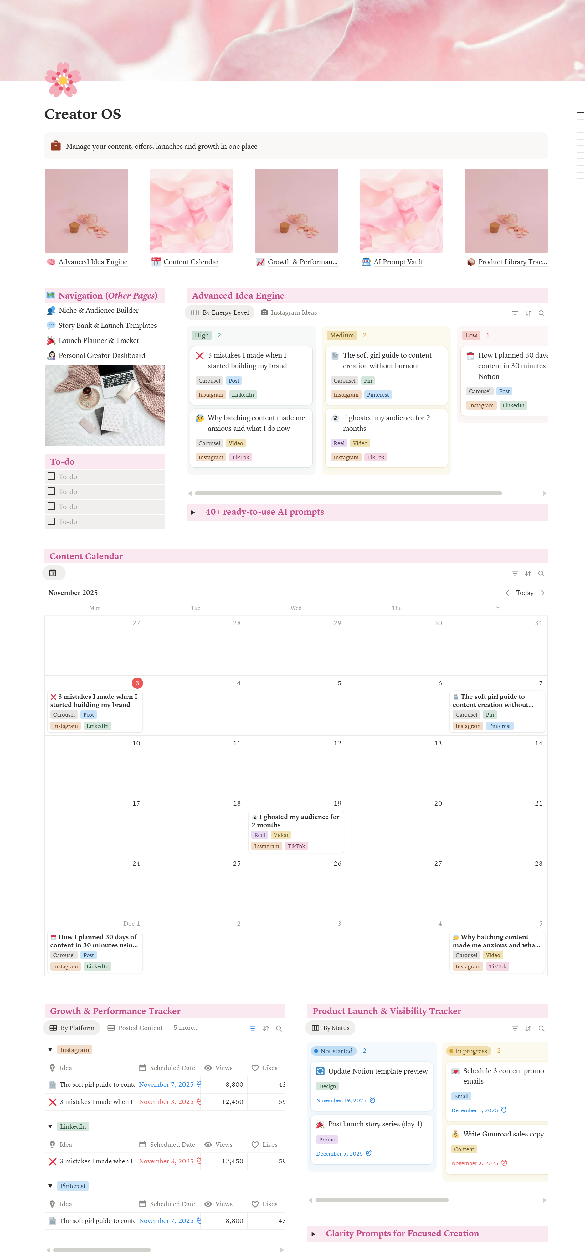 Plan content, run launches, repurpose posts, and track performance in one Notion workspace, so you can stay consistent, avoid burnout, and turn ideas into income💸