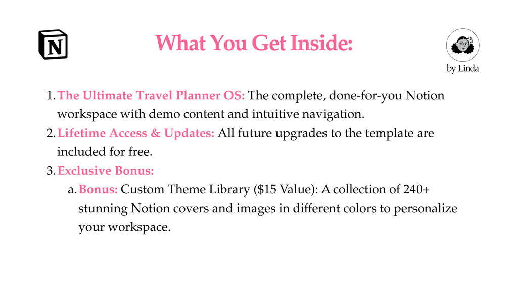- The Ultimate Travel Planner OS: The complete, done-for-you Notion workspace with demo content and intuitive navigation.